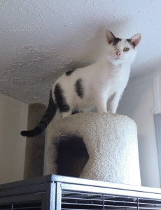 Trace the one-eyed cat perches from the top of a cat tree in one of the cat rooms at Animal Rescue Fund’s Catty Shack in Muncie, IN on Saturday, April 9, 2022. (Madelyn Guinn). April 9, 2022April 9, 2022 | shootforgoodmuncie