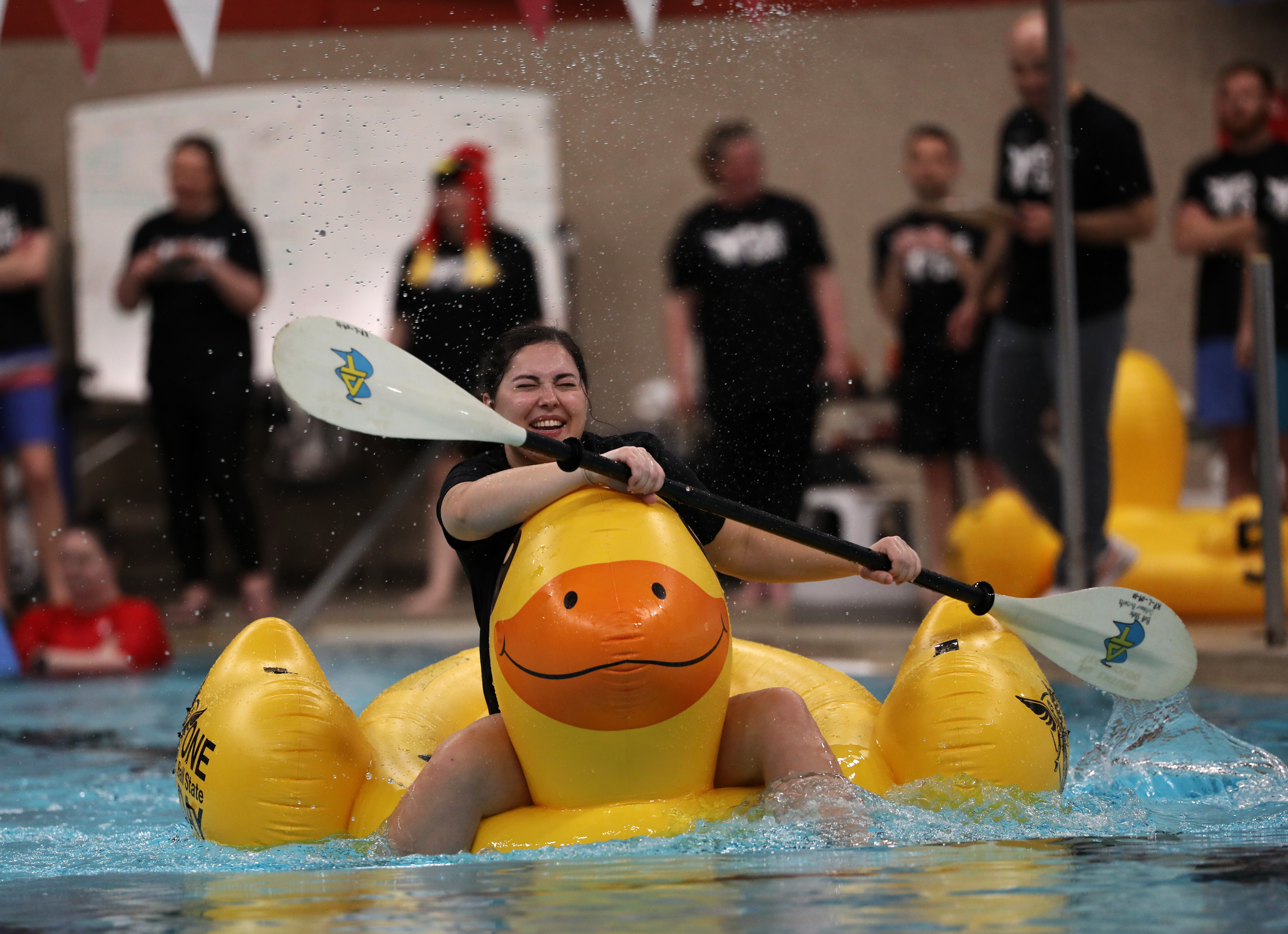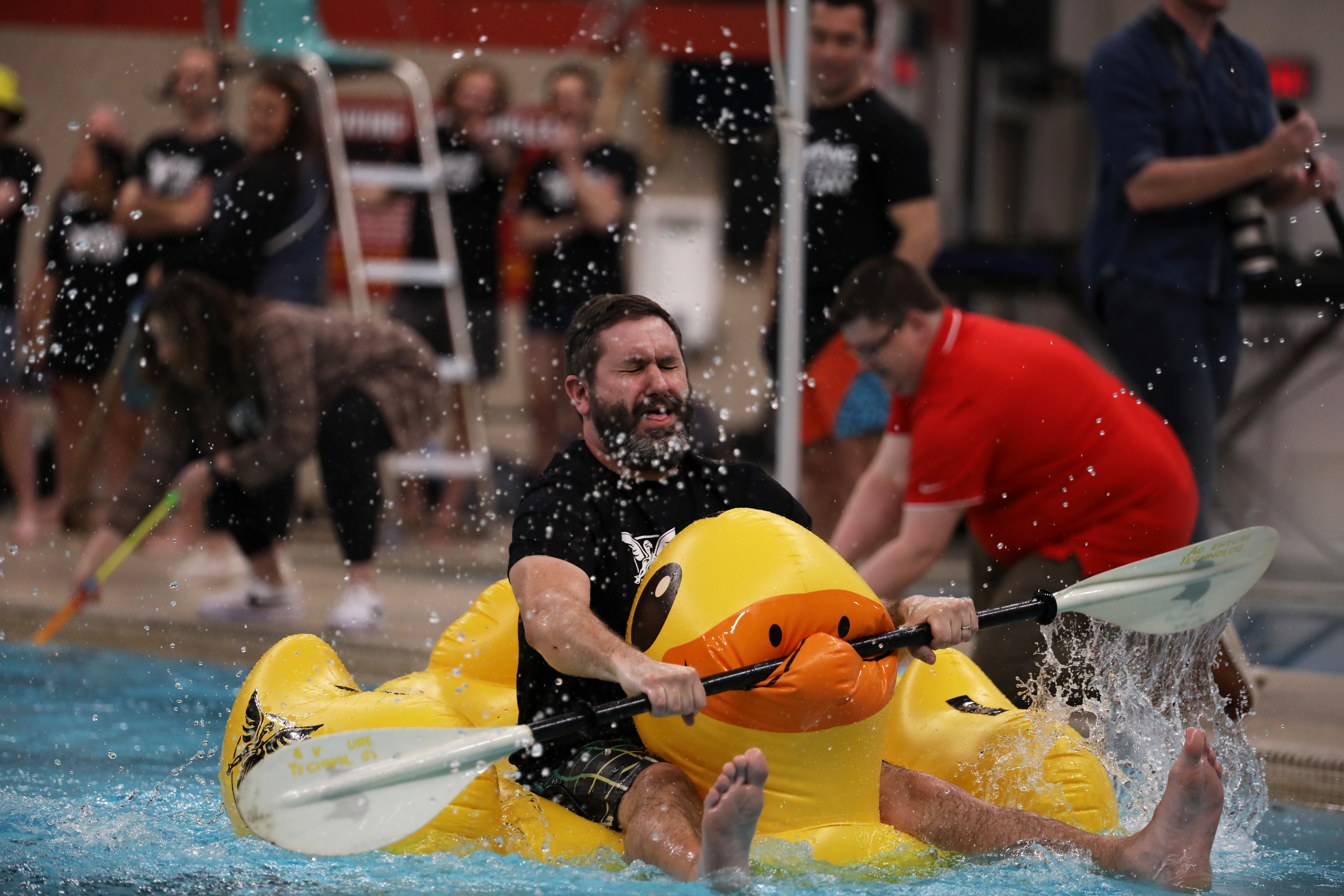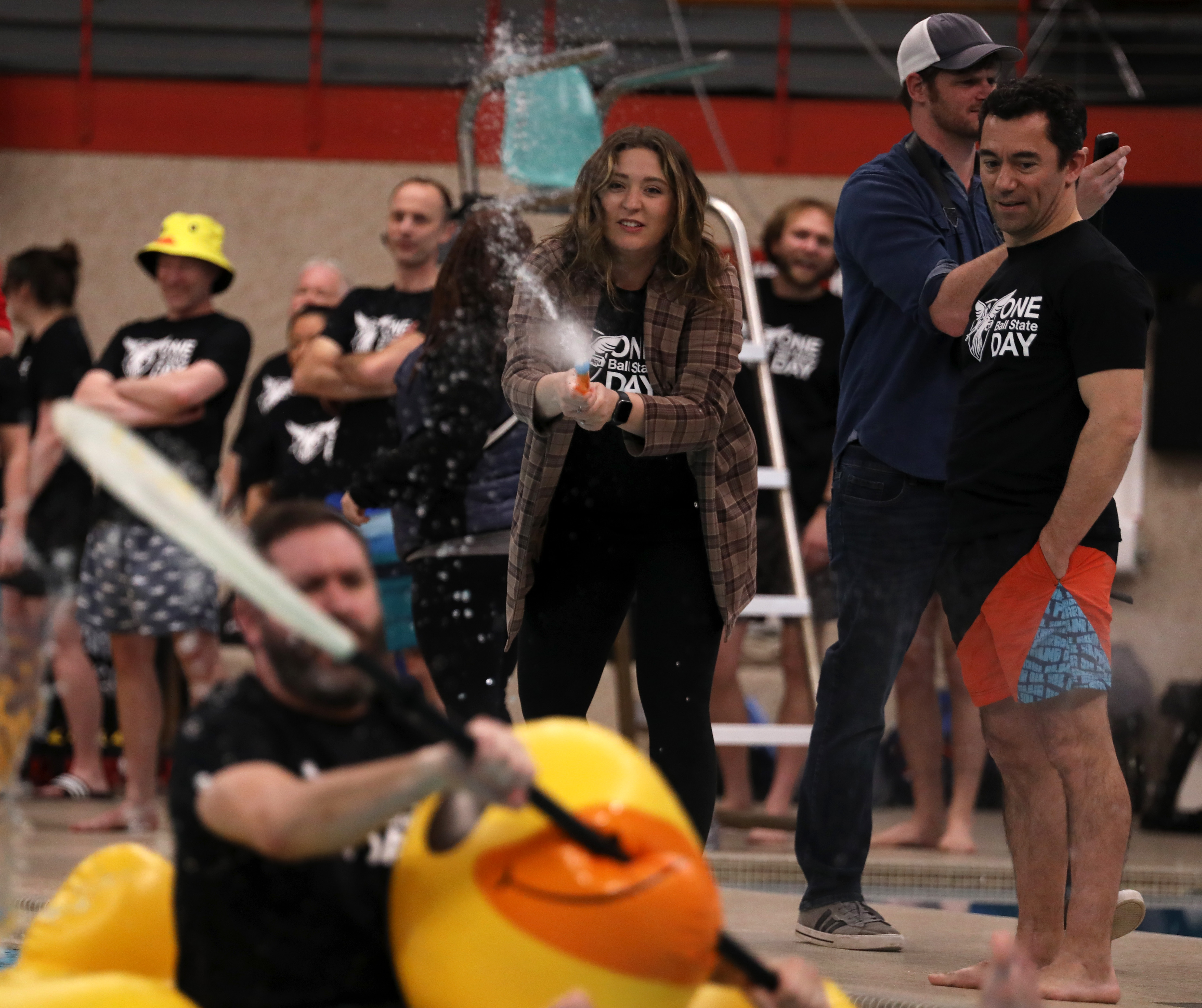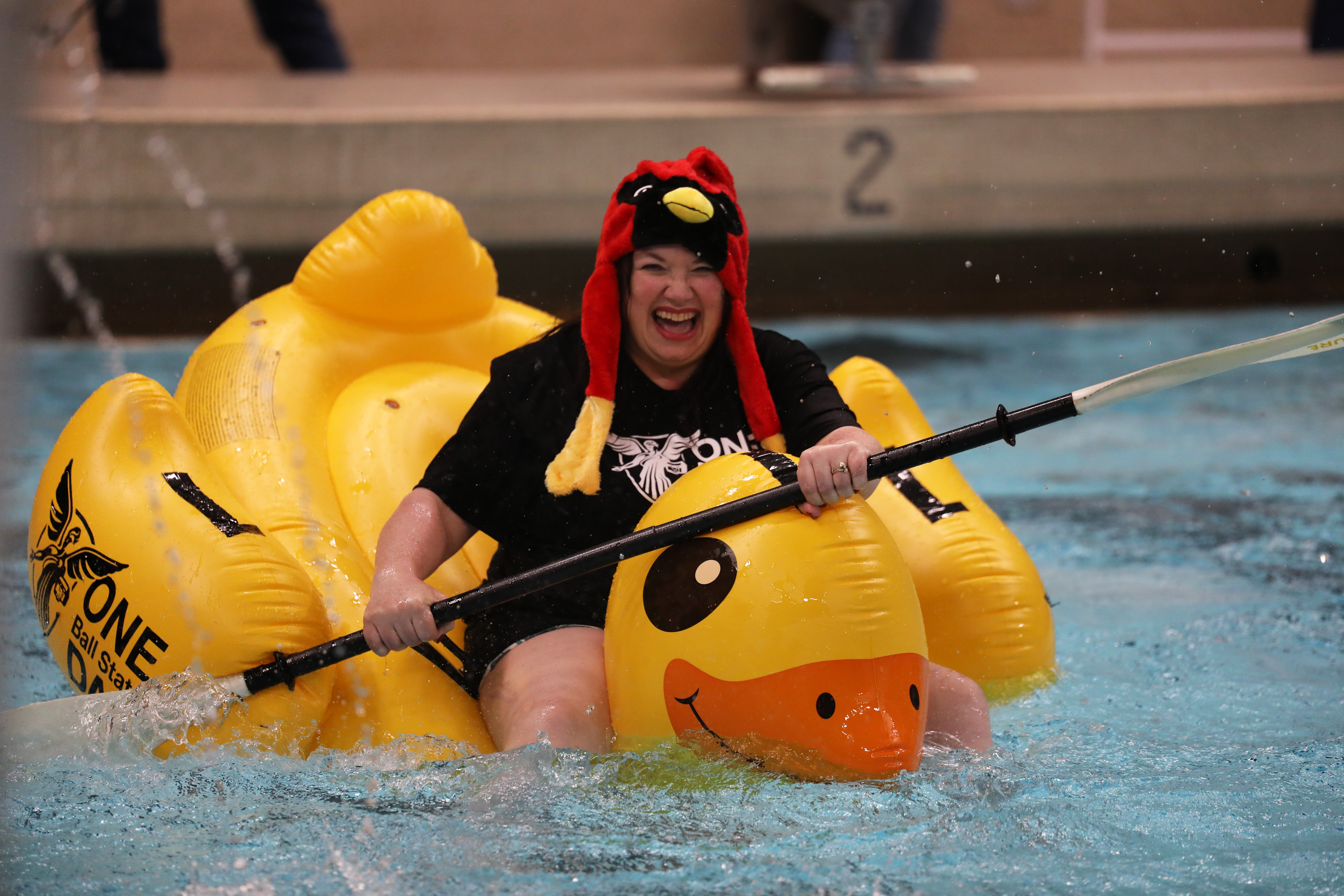 The Duck Races are an event put together by Ball State University’s Alumni Foundation for One Ball State Day. OBSD is a huge day of fundraising to increase funding for events and programs on campus. During these races, volunteers race inflatable ducks and use oars to cross the pool. Volunteers are based on nominations, in addition to the volunteers who stand on the sidelines to use water guns to knock opponents off their ducks. Photos by Mya Cataline, Samantha Lyon and Emma Gsell