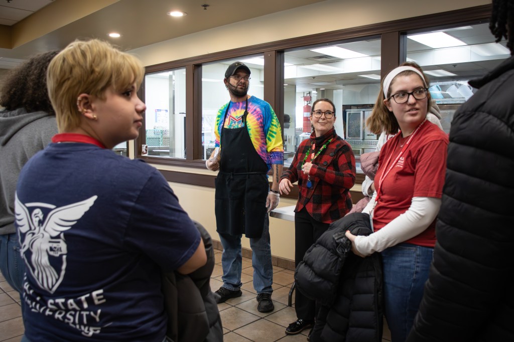 Muncie Mission Vice President of Community Engagement, Leigh Edwards [center, checkered shirt], assigns tasks to a group of volunteers at Muncie Mission Ministries on Tuesday, March 17, 2026, in Muncie, Ind. (Photo by Ian Terrell)
