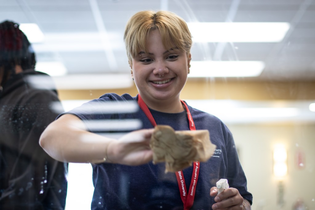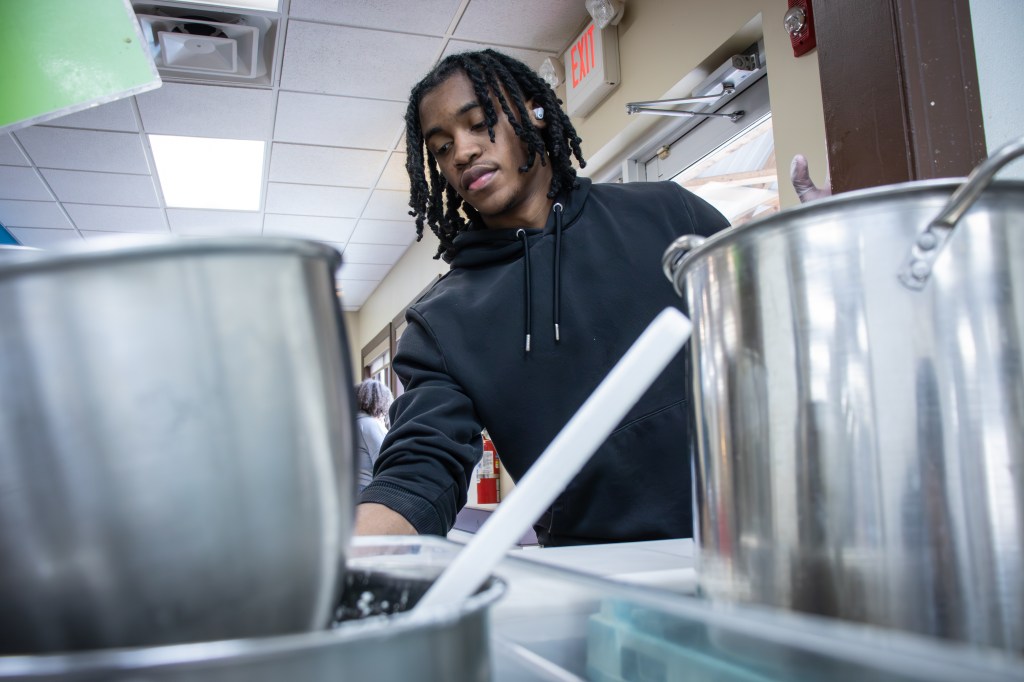 Ball State University student Leo Sioson cleans a cafeteria window during a volunteer cleaning event at Muncie Mission Ministries on Tuesday, March 17, 2026, in Muncie, Ind. (Photo by Ian Terrell)
