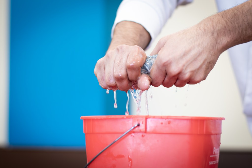 A volunteer worker squeezes water out of a towel during a volunteer cleaning event at Muncie Mission Ministries on Tuesday, March 17, 2026, in Muncie, Ind. (Photo by Ian Terrell)