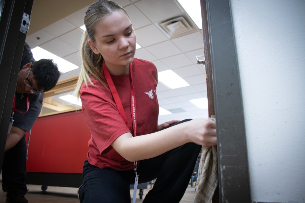 Ball State University students Brady Wachtel [left] and Taylor Borowski [right] clean door hinges during a volunteer cleaning event at Muncie Mission Ministries on Tuesday, March 17, 2026, in Muncie, Ind. (Photo by Ian Terrell)