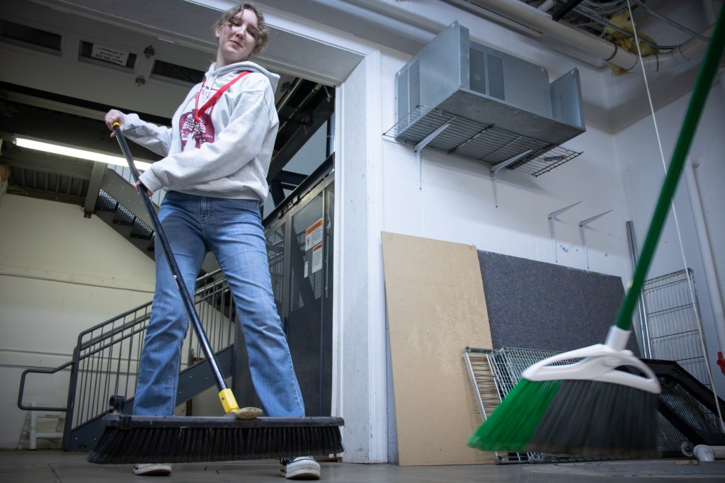 Ball State University student Aubrey Tyler sweeps the basement floor during a volunteer cleaning event at Muncie Mission Ministries on Tuesday, March 17, 2026, in Muncie, Ind. (Photo by Ian Terrell)
