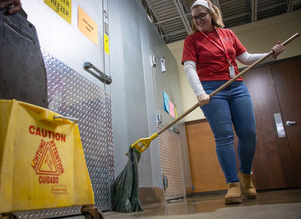 Ball State University student Jackie Christiansen mops the basement floor during a volunteer cleaning event at Muncie Mission Ministries on Tuesday, March 17, 2026, in Muncie, Ind. (Photo by Ian Terrell)
