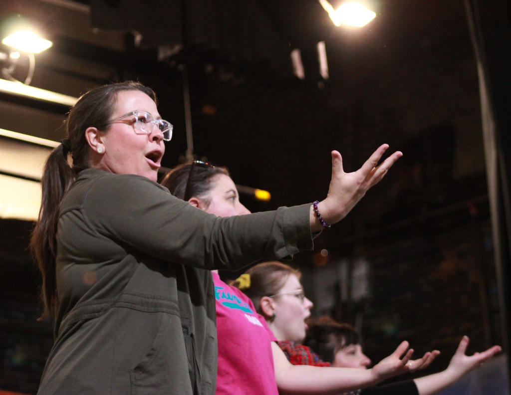 The Hello, Dolly! cast does vocal warm-ups at Muncie Civic Theatre on Monday, March 30, 2026, in Muncie, Ind. (Photo by Branden Woods)