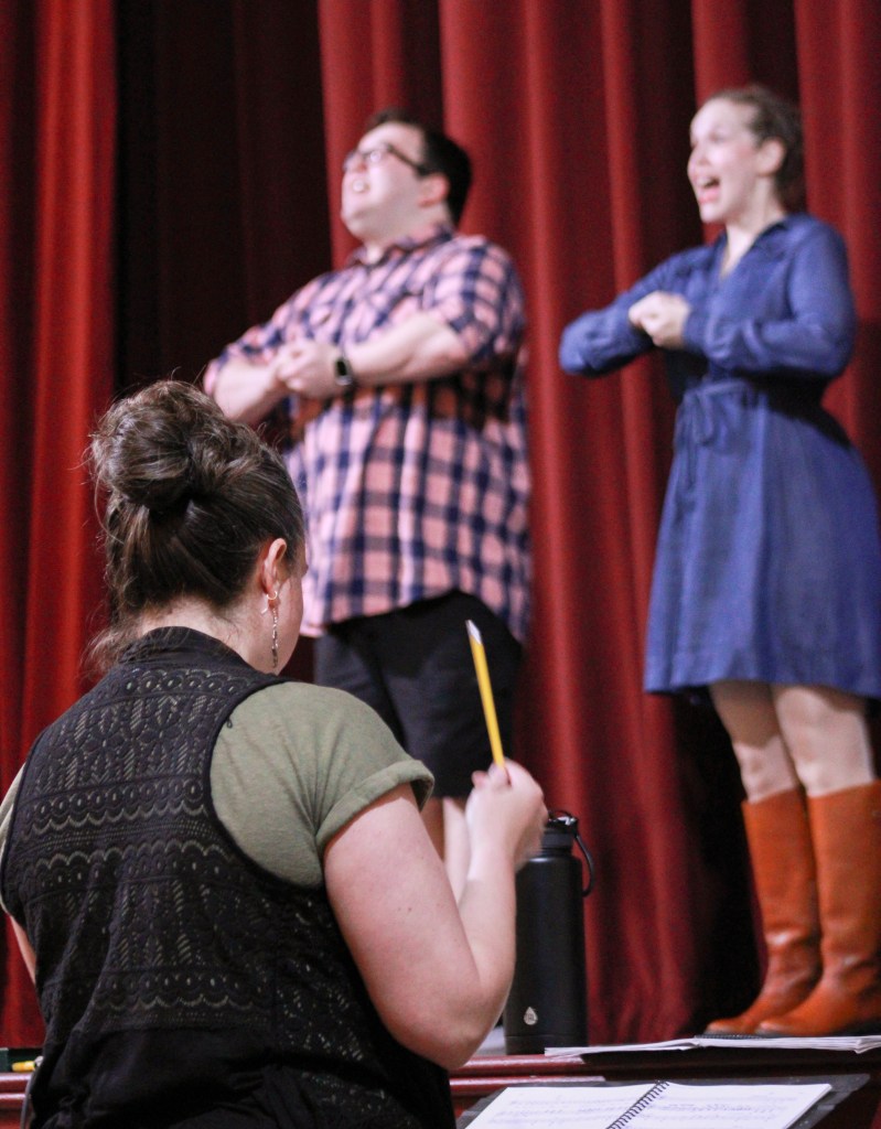 Musical Director Sally Kelley checks the vocals of a song for Hello, Dolly! at Muncie Civic Theatre on Monday, March 30, 2026, in Muncie, Ind. (Photo by Branden Woods)