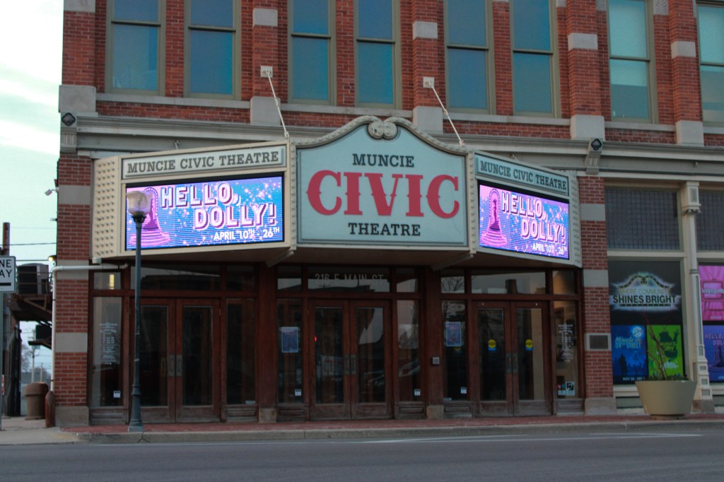 Muncie Civic Theatre advertises upcoming showings of Hello, Dolly! on Monday, March 30, 2026, in Muncie, Ind. (Photo by Branden Woods)