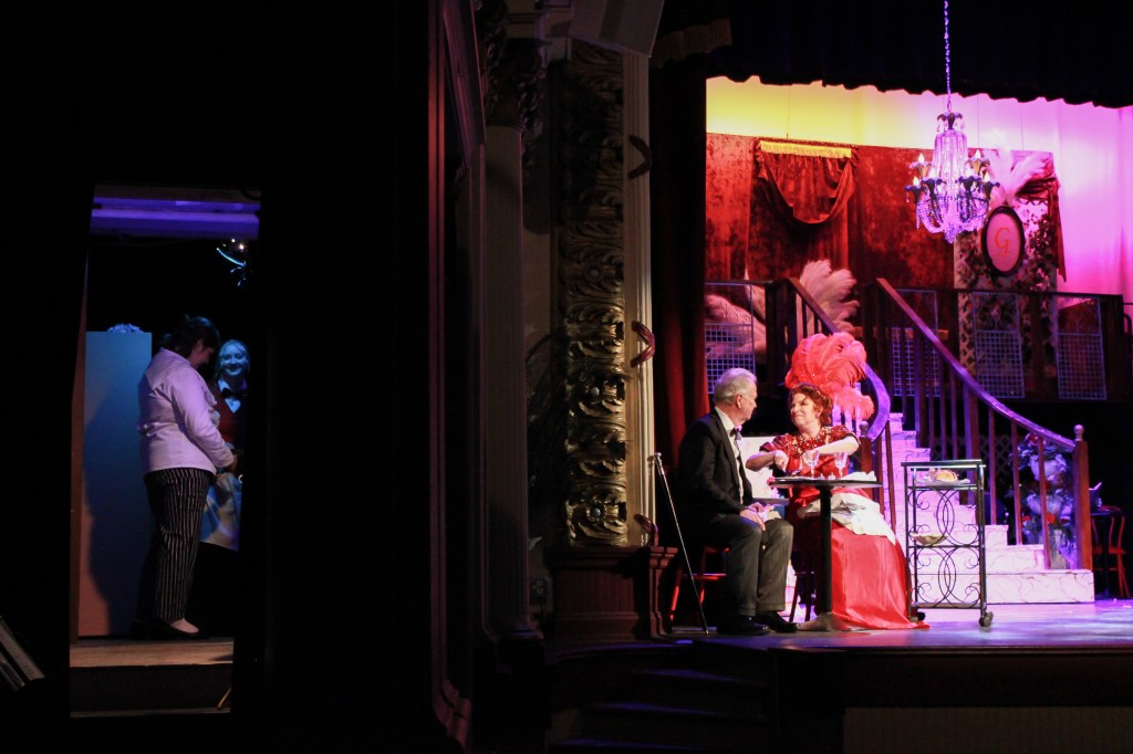 Actors for Horace and Dolly, [John Finley and Susan Smith] act onstage while their fellow cast members wait backstage at Muncie Civic Theatre on Monday, April 6, 2026, in Muncie, Ind. (Photo by Branden Woods)