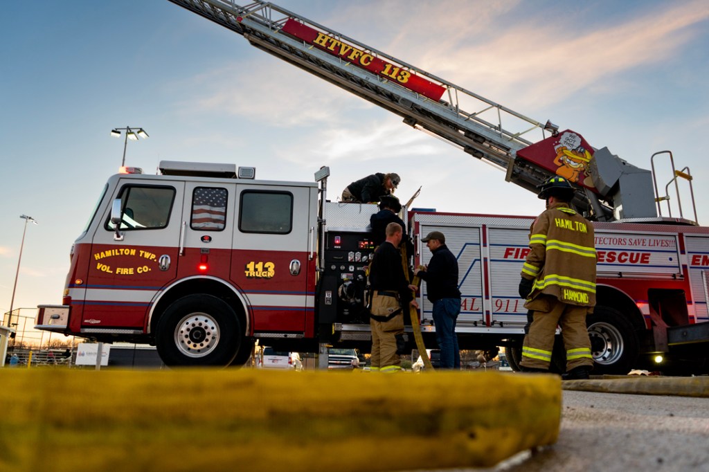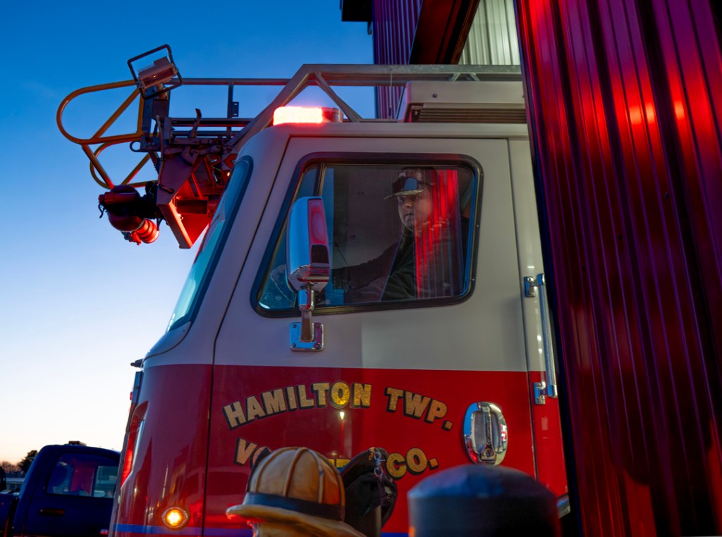 After finishing their day jobs, volunteer firefighters gather at the Hamilton Township Volunteer Fire Department to train, prepare and wait for calls. Serving as backup for surrounding departments, they remain on call to respond when others cannot. Through routine drills and shared responsibility, these firefighters balance everyday life with the demands of protecting their community. (Photos by Isabella Kemper)