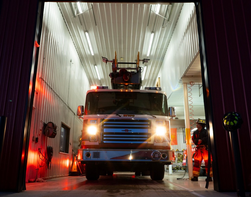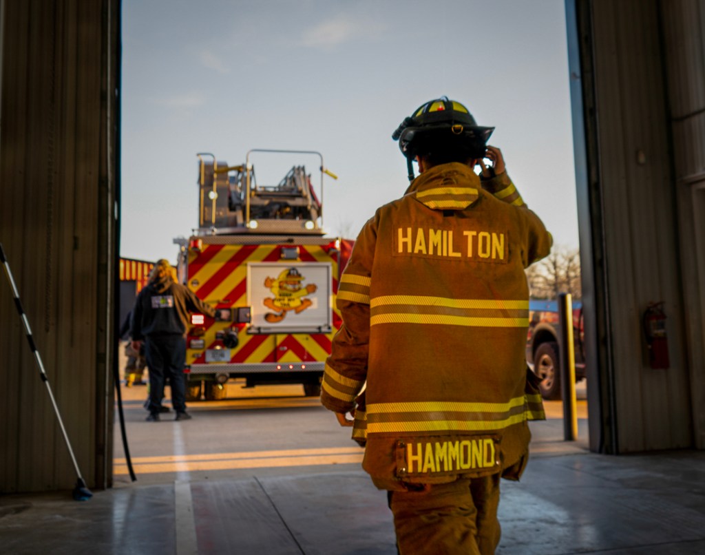 Firefighter Hammond walks out of the bay to the ladder truck on Tuesday, April 7, 2026, in Muncie, Ind. (Photo by Isabella Kemper)