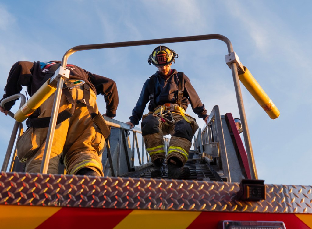 Firefighters Hatfield and Smith climb up the extension ladder on the ladder truck on Tuesday, April 7, 2026, in Muncie, Ind. (Photo by Isabella Kemper)