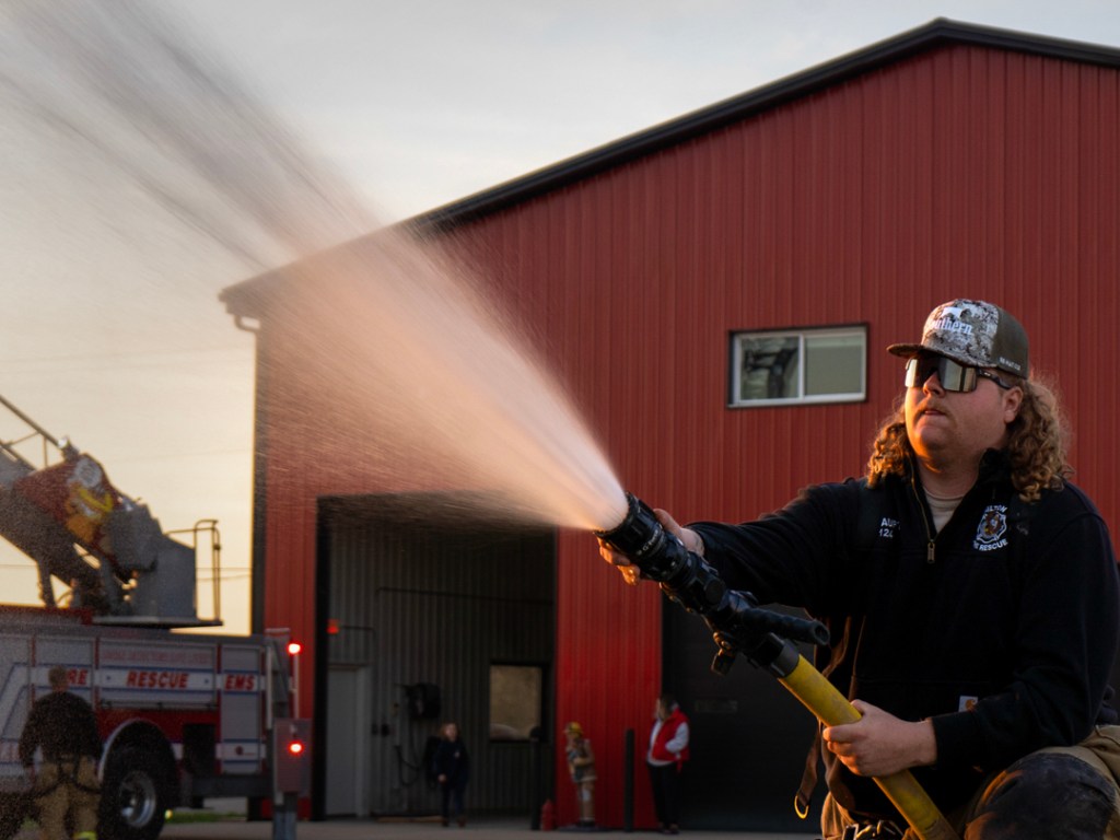 Chief Blake Haupt sprays the hose in a side lot at the Hamilton Township Volunteer Fire Department on Tuesday, April 7, 2026, in Muncie, Ind. (Photo by Isabella Kemper)