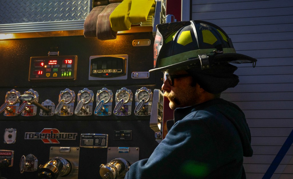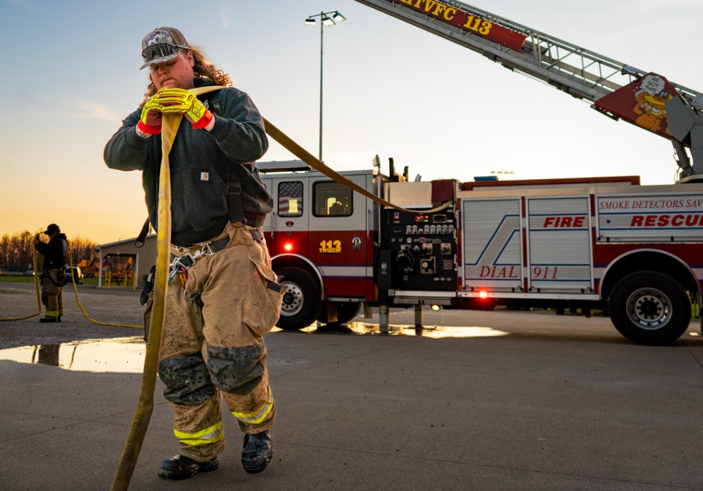 Firefighter Hatfield stands by the ladder truck as the hose fills on Tuesday, April 7, 2026, in Muncie, Ind. All firefighters at Hamilton Township Volunteer Fire Department volunteer in their free time. (Photo by Isabella Kemper)