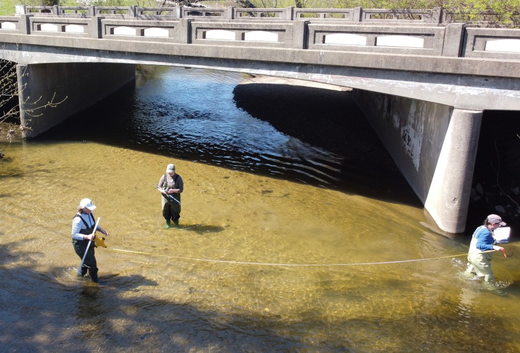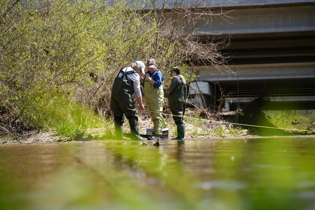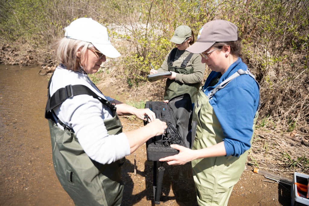 [From left to right] Rebecca Rees, Theresa Ingermann and Kelly Brown set up to take water samples at Honey Creek on Sunday, March 29, 2026, in Martinsville, Ind. (Photo by Kyle Ingermann)