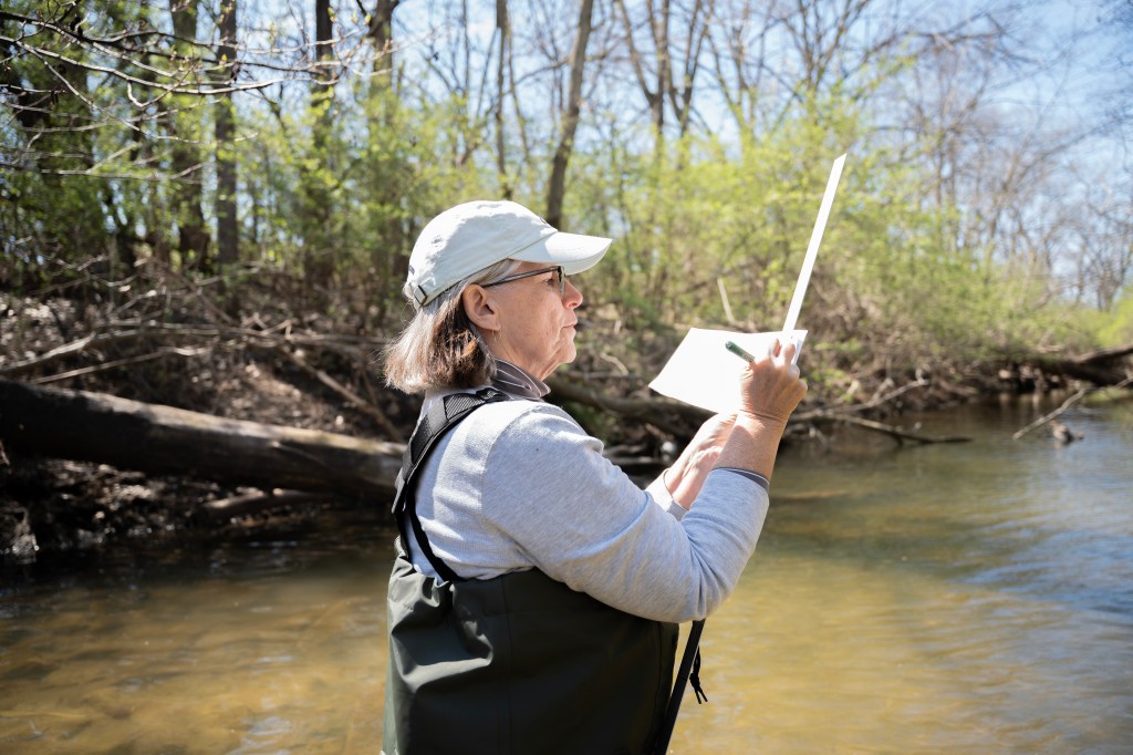 Rebecca Rees takes notes for water sample data gathered at Honey Creek on Sunday, March 29, 2026, in Martinsville, Ind. (Photo by Kyle Ingermann)