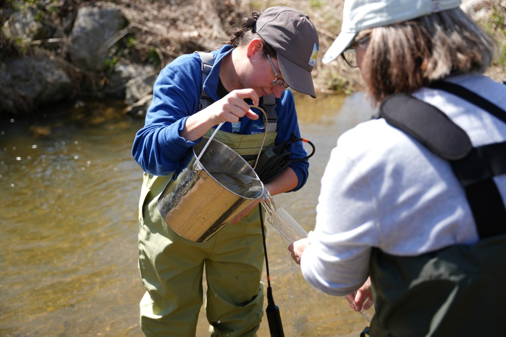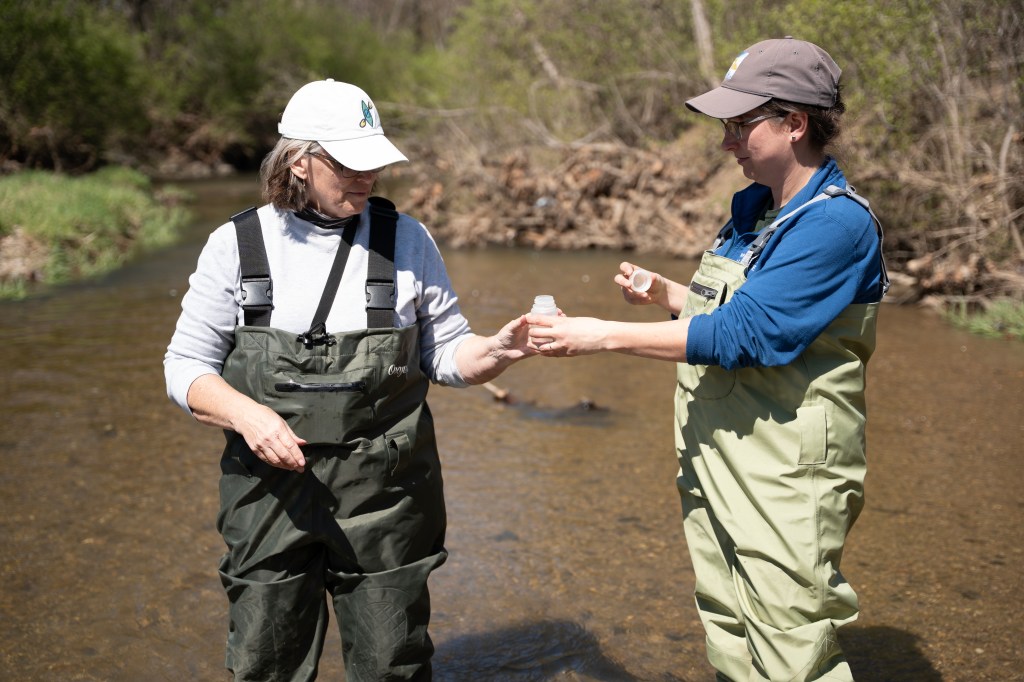 Rebecca Rees [left] and Kelly Brown [right] prepare a container for water samples at Honey Creek on Sunday, March 29, 2026, in Martinsville, Ind. (Photo by Kyle Ingermann)