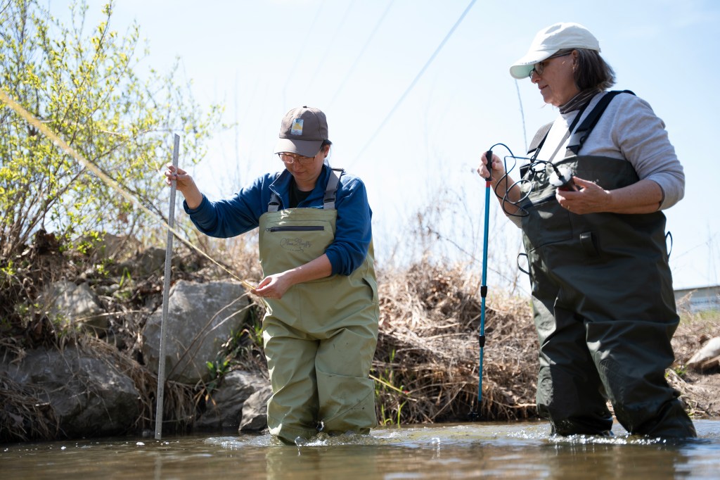 Rebecca Rees [right] and Kelly Brown [left] test water flow at Honey Creek on Sunday, March 29, 2026, in Martinsville, Ind. (Photo by Kyle Ingermann)