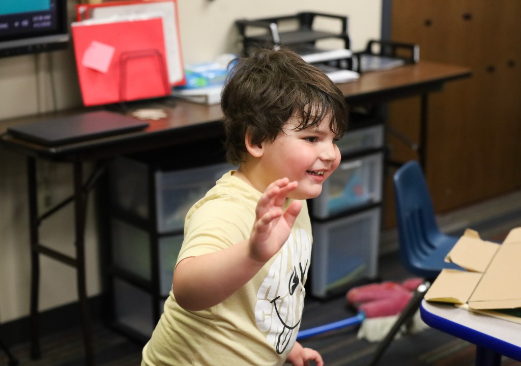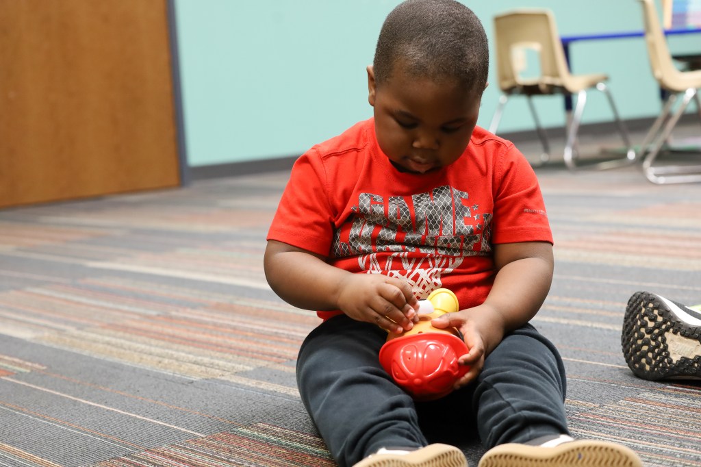 A Hillcroft client plays with a Mr. Potato Head toy on Wednesday, April 1, 2026, at Hillcroft Services in Muncie, Ind. (Photo by Mallory Hall)