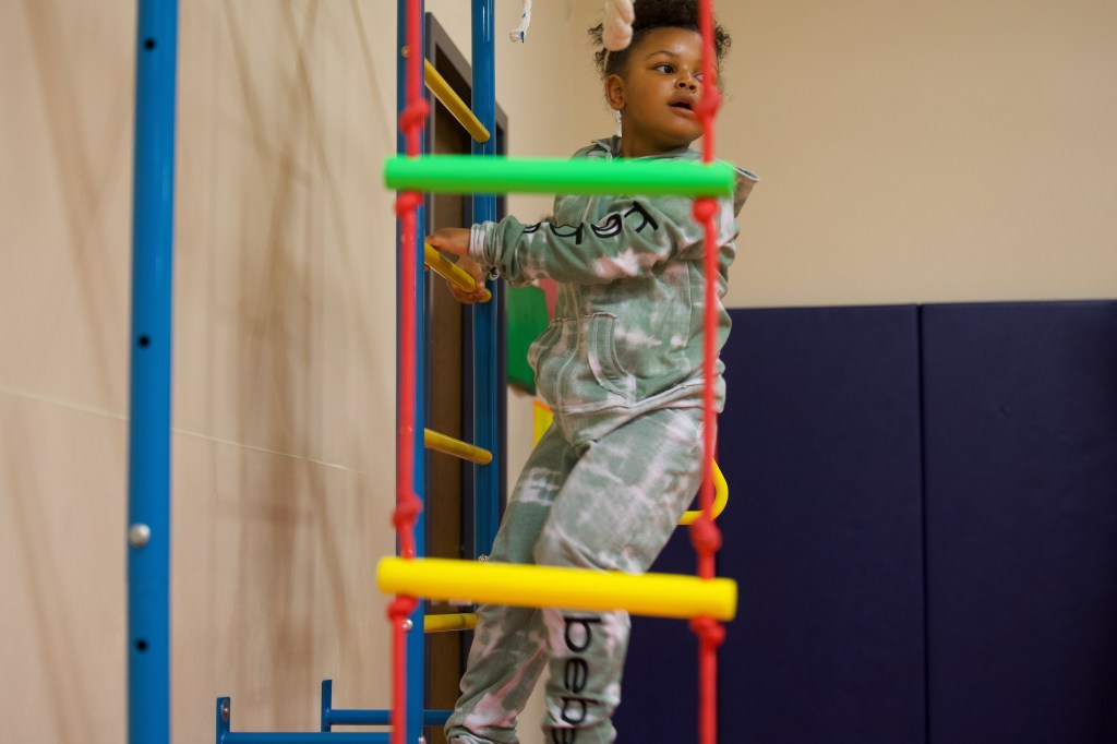 A Hillcroft client climbs on a ladder in the gym area on Wednesday, April 1, 2026, at Hillcroft Services in Muncie, Ind. (Photo by Mallory Hall)