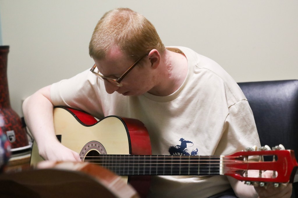 A Hillcroft client tunes the guitar during his one-on-one music therapy session on Wednesday, April 1, 2026, at Hillcroft Services in Muncie, Ind. (Photo by Mallory Hall)