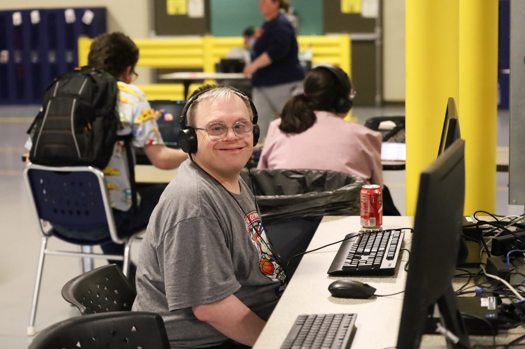 A Hillcroft client poses for a photo while sitting at a computer on Wednesday, April 1, 2026, at Hillcroft Services in Muncie, Ind. (Photo by Mallory Hall)