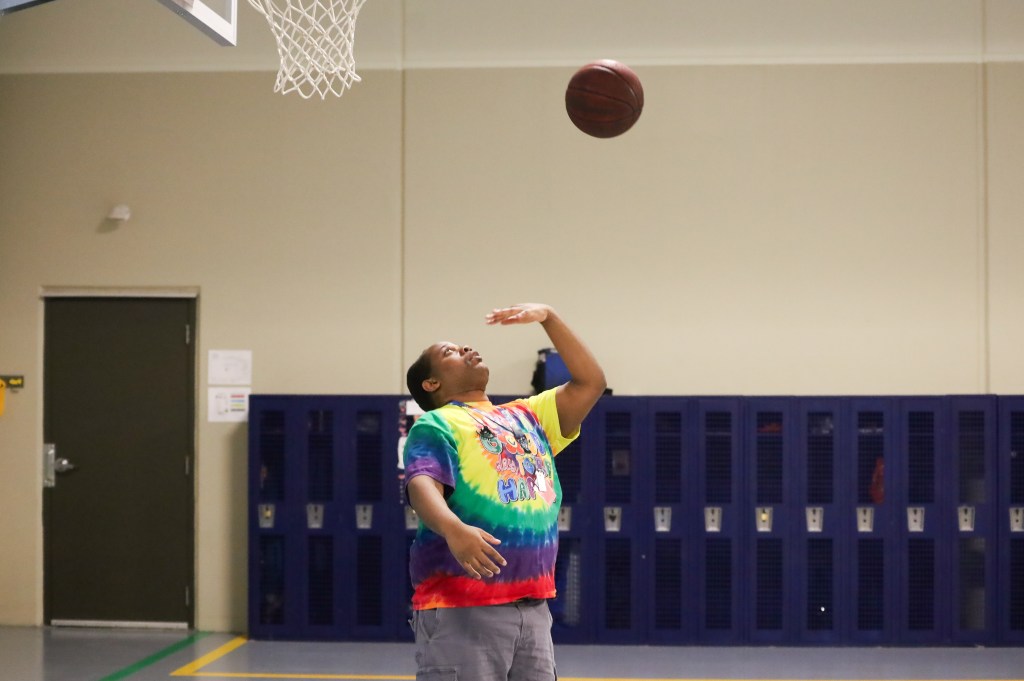 Hillcroft client plays basketball in the recreation area on Wednesday, April 1, 2026, at Hillcroft Services in Muncie, Ind. (Photo by Mallory Hall)