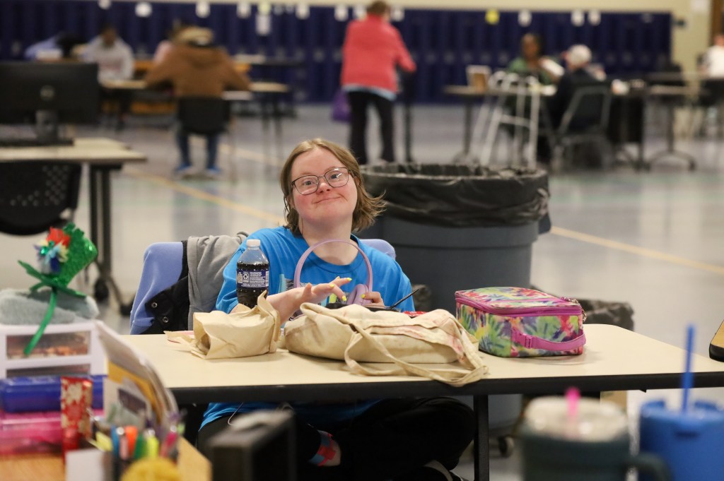 A Hillcroft client poses for a picture while playing on an iPad during lunch on Wednesday, April 1, 2026, at Hillcroft Services in Muncie, Ind. (Photo by Mallory Hall)