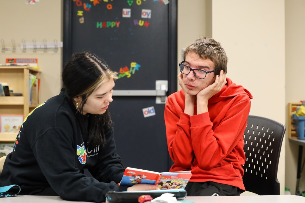 A Hillcroft client plugs his ear while his ABA therapist reads a book to him on Wednesday, April 1, 2026, at Hillcroft Services in Muncie, Ind. (Photo by Mallory Hall)