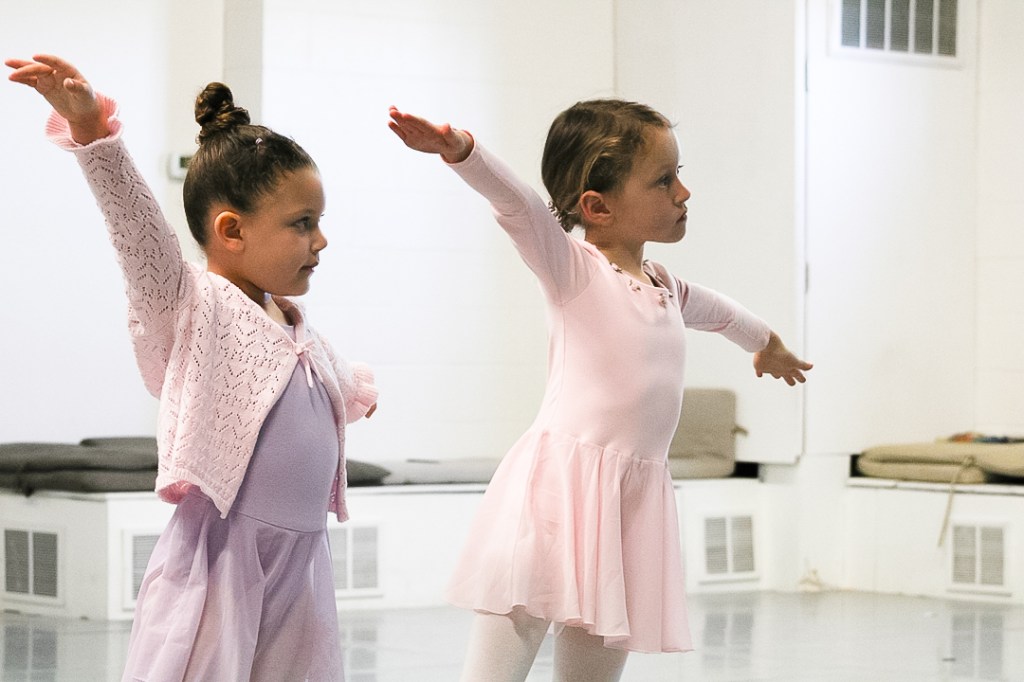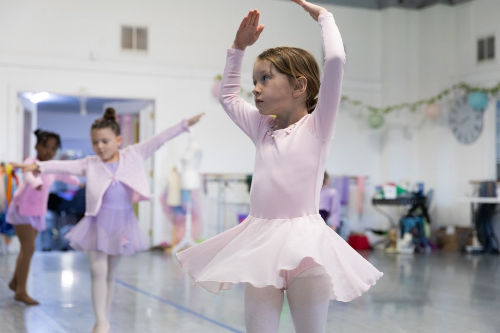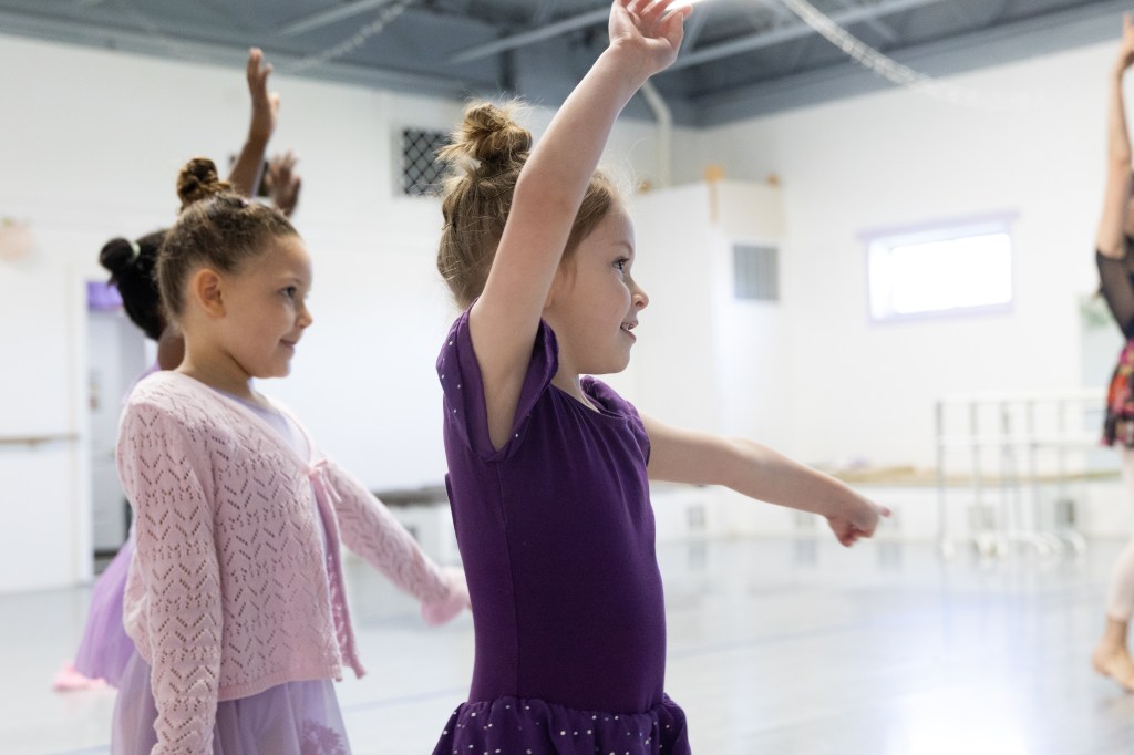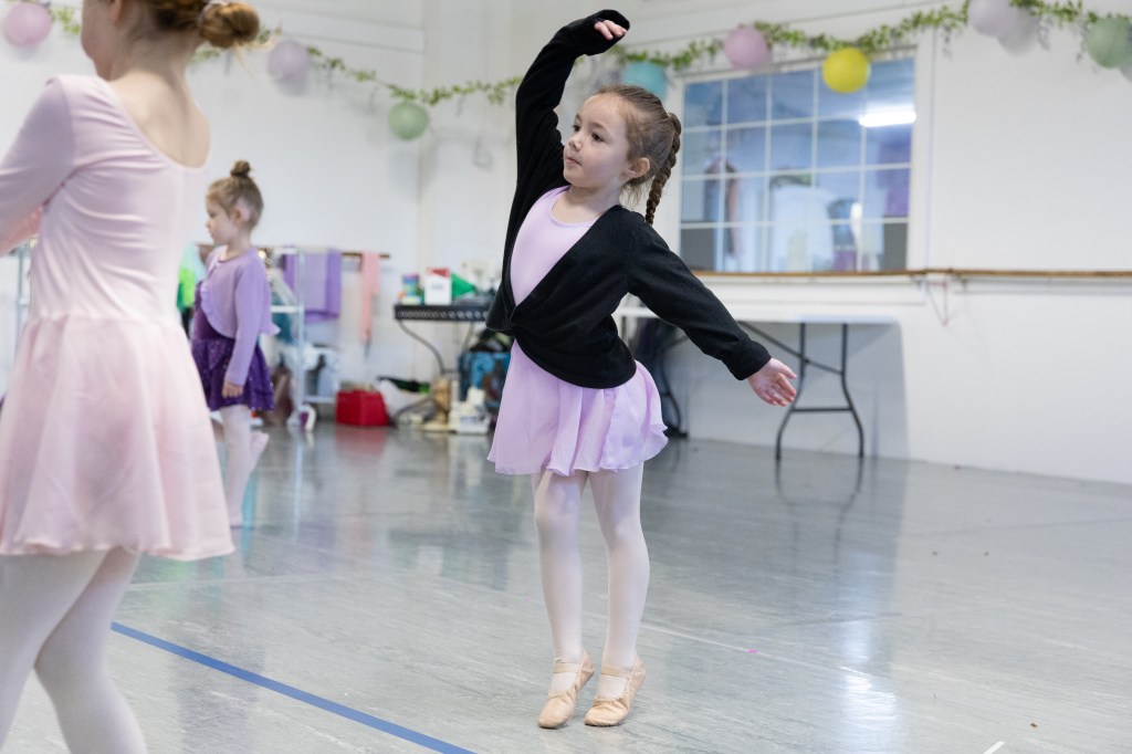 The ballerina stretches her arms as she does her next move. Miss Lisa helped ensure that they were held correctly in class at the Muncie Ballet studio on Saturday, March 28, 2026. (Photo by Kaylee Kern)