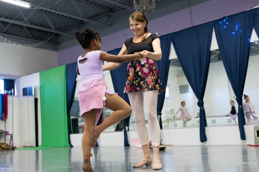 Miss Lisa holds a student’s arms as she is balancing. The student was learning a new skill at the Muncie Ballet studio on Saturday, March 28, 2026. (Photo by Kaylee Kern)