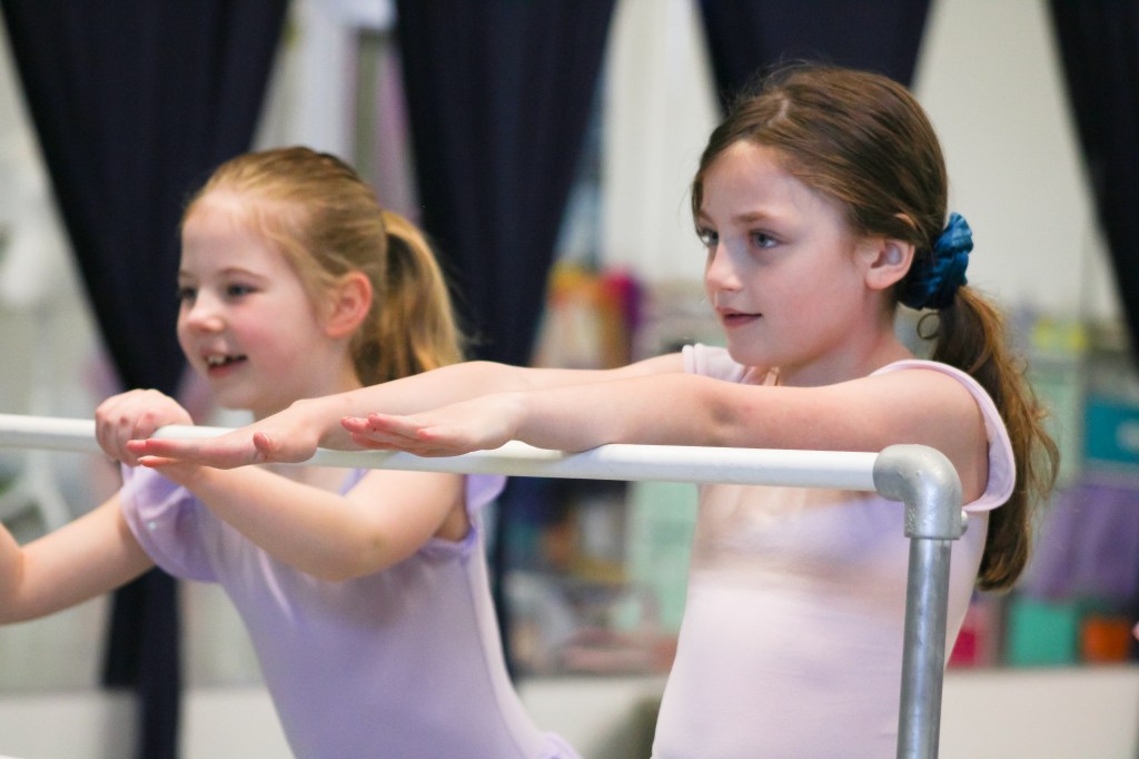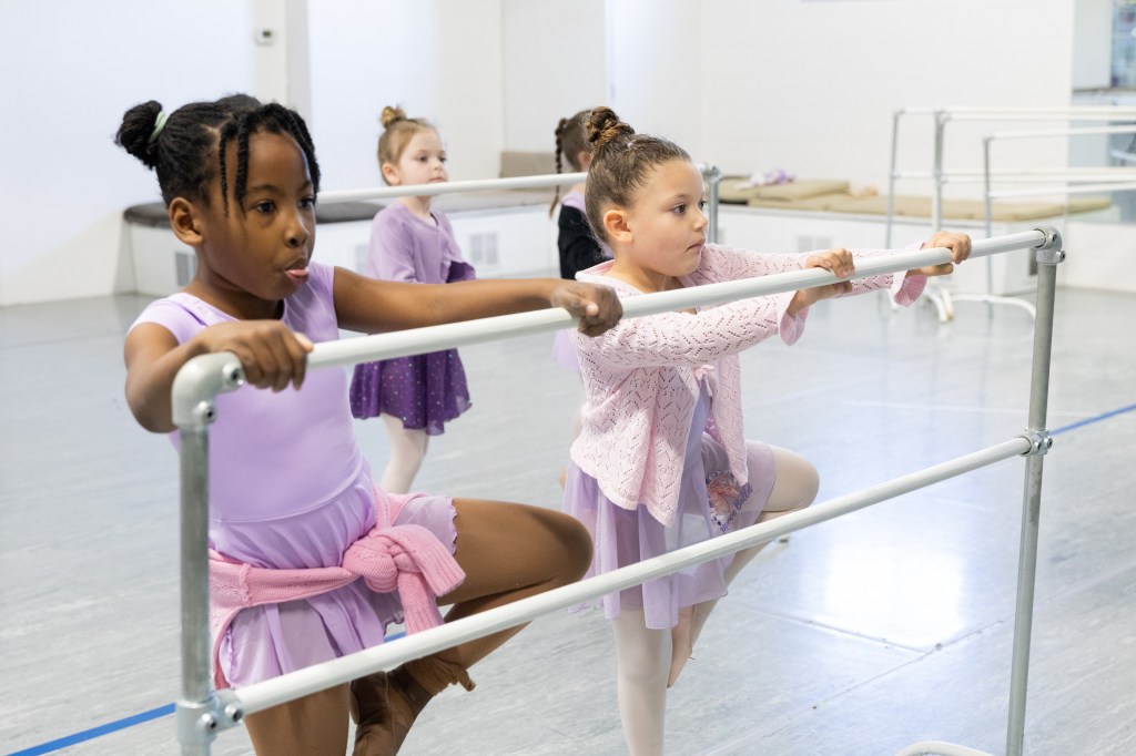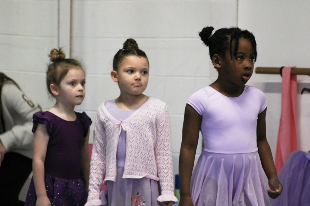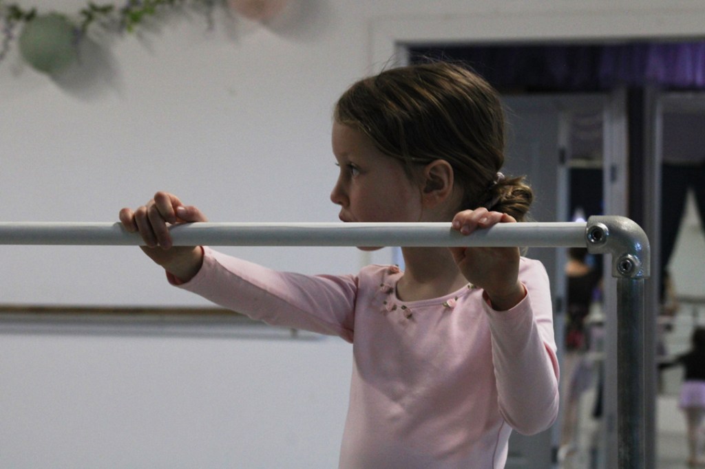 Ballerinas line up at the bar at the Muncie Ballet studio on Saturday, March 28, 2026. (Photo by Kennedy Court)