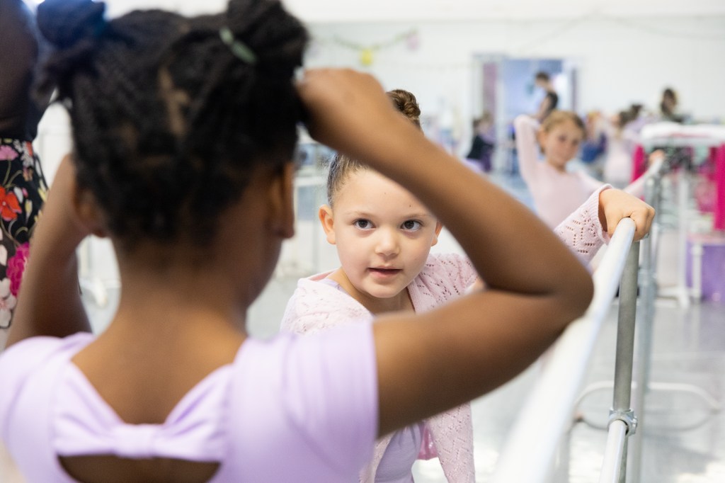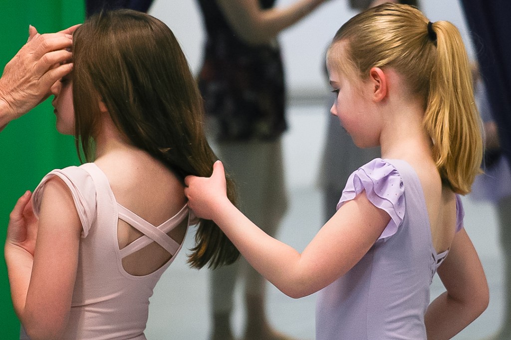 A ballerina helps her classmate pull up her hair for class at the Muncie Ballet studio on Saturday, March 28, 2026. (Photo by Kennedy Court)