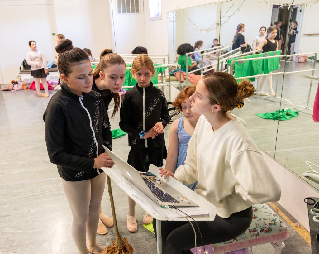 Ballerinas discuss their music with a teacher during rehearsal at the Muncie Ballet studio on Saturday, March 28, 2026. (Photo by Anna Evilsizor)