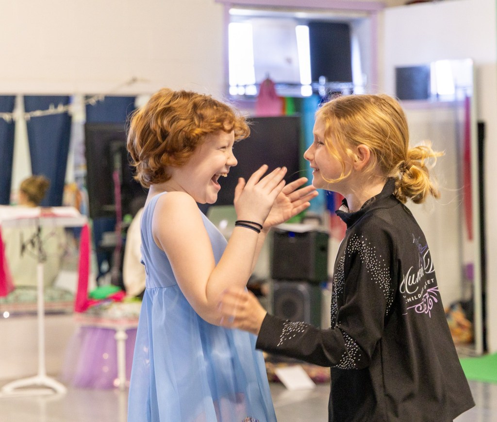 Ballerinas laugh with each other during their rehearsal of Oz, the Ballet, at the Muncie Ballet studio on Saturday, March 28, 2026. (Photo by Anna Evilsizor)