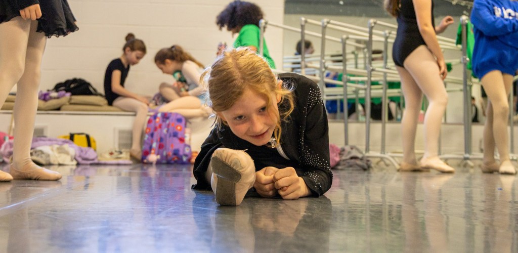 A Muncie Ballet dancer stretches into the splits as she prepares to rehearse at the Muncie Ballet studio on Saturday, March 28, 2026. (Photo by Anna Evilsizor)